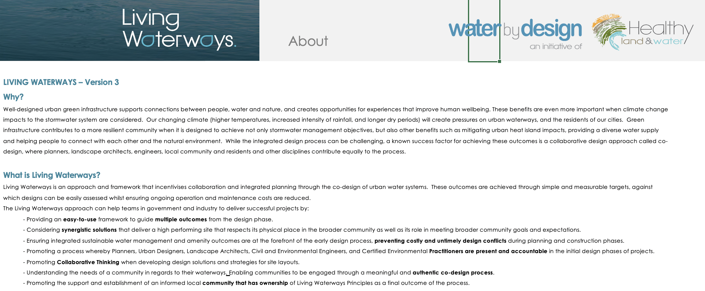 Living Waterways is a tool used to assist designers to create holistic stormwater and waterway solutions. It links to the State’s Stormwater Quality Design Objectives (SMDOs) and is a valid alternative to ‘business as usual’ Water Sensitive Urban Design (WSUD) installations.